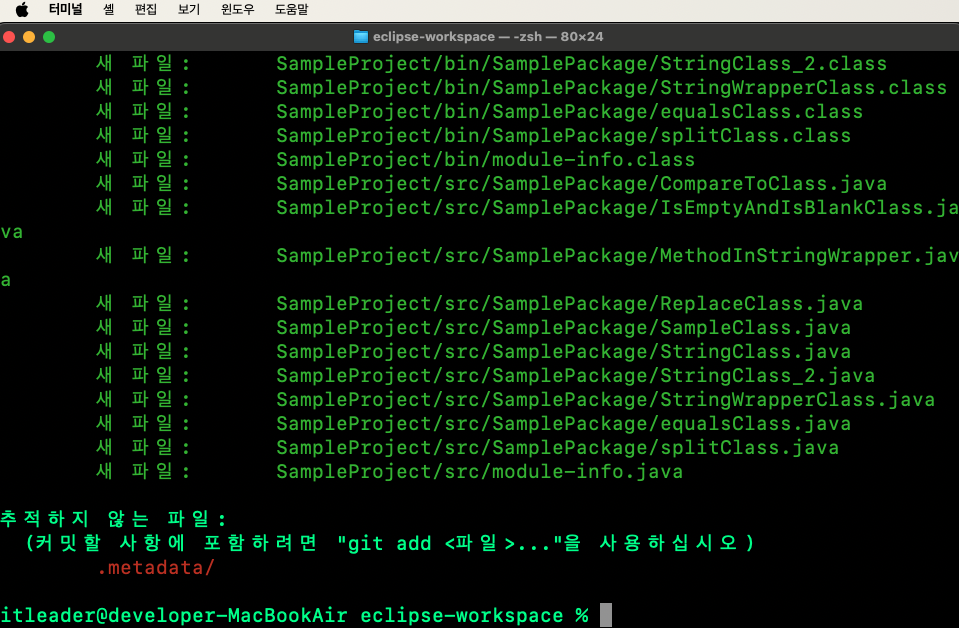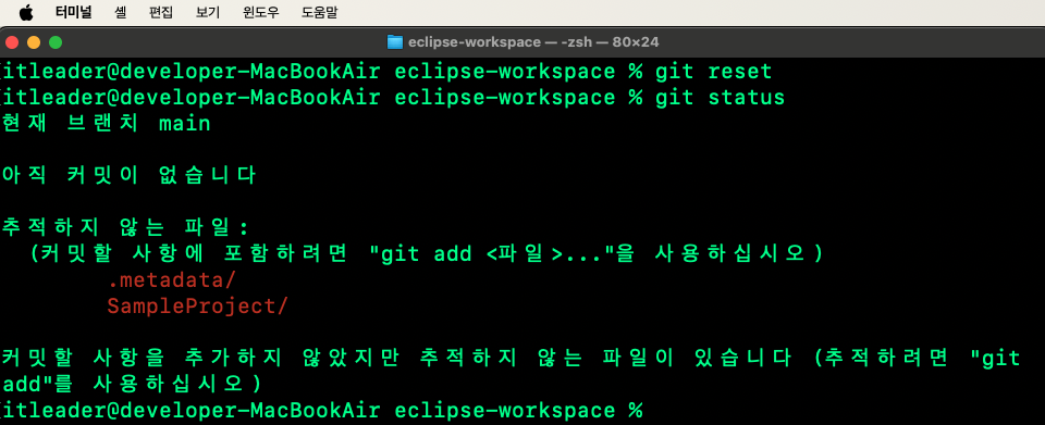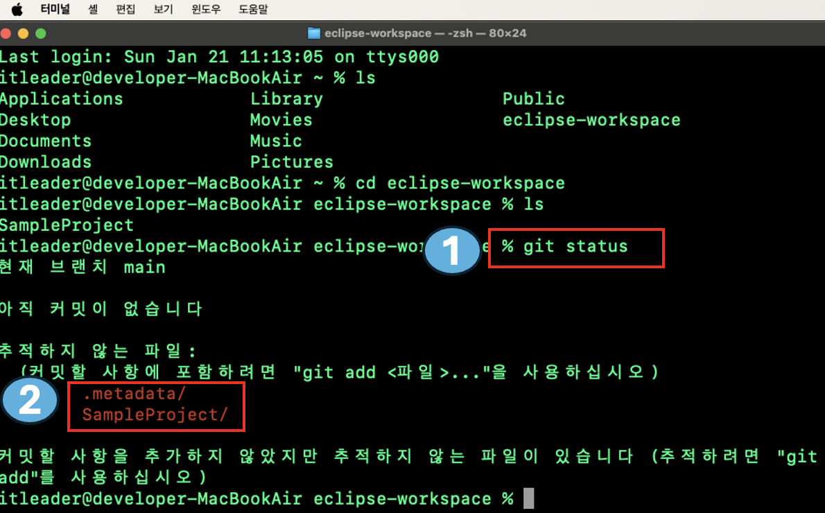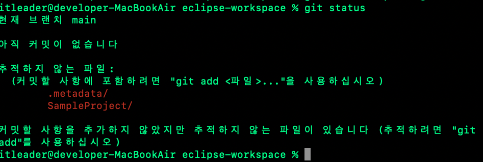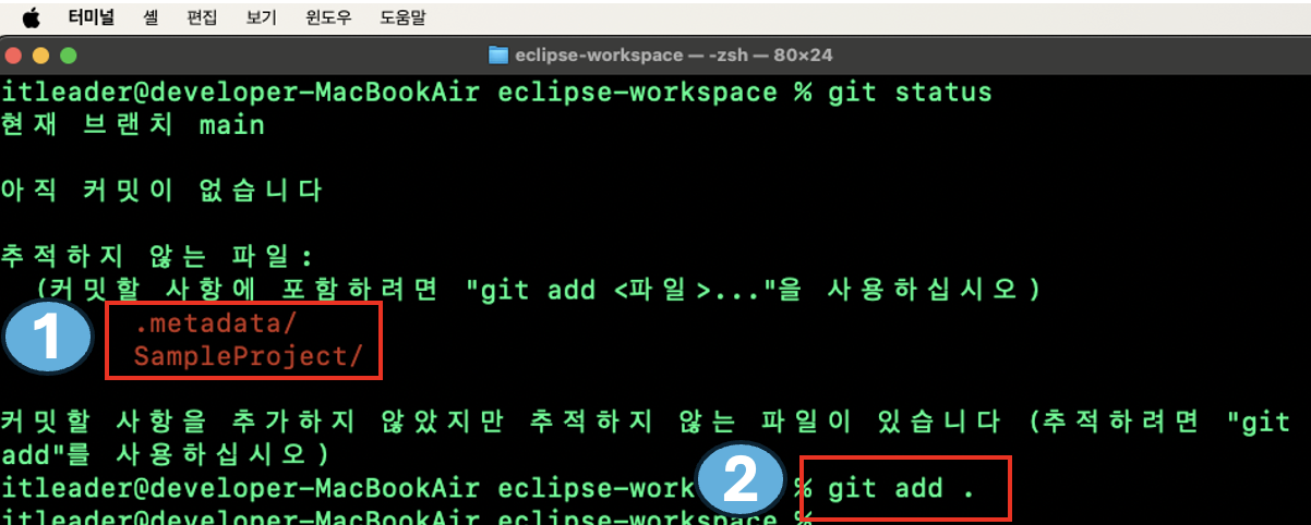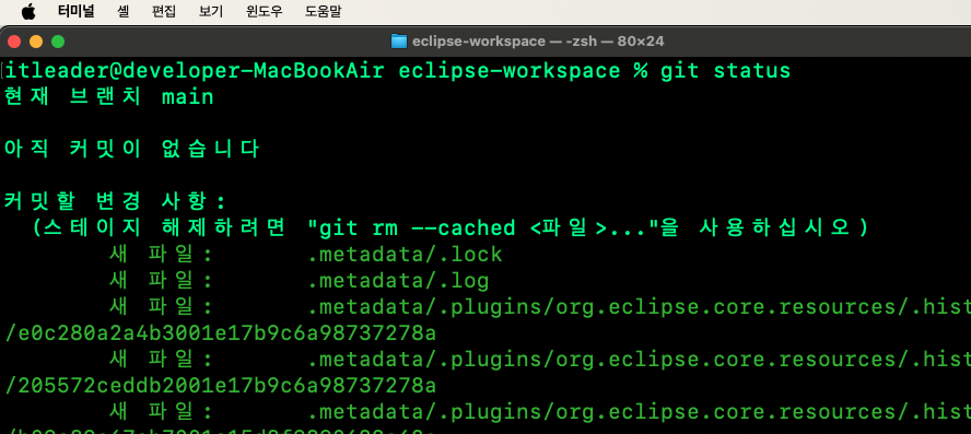 2번을 보시면 git add .metadata 명령어를 입력한 모습을