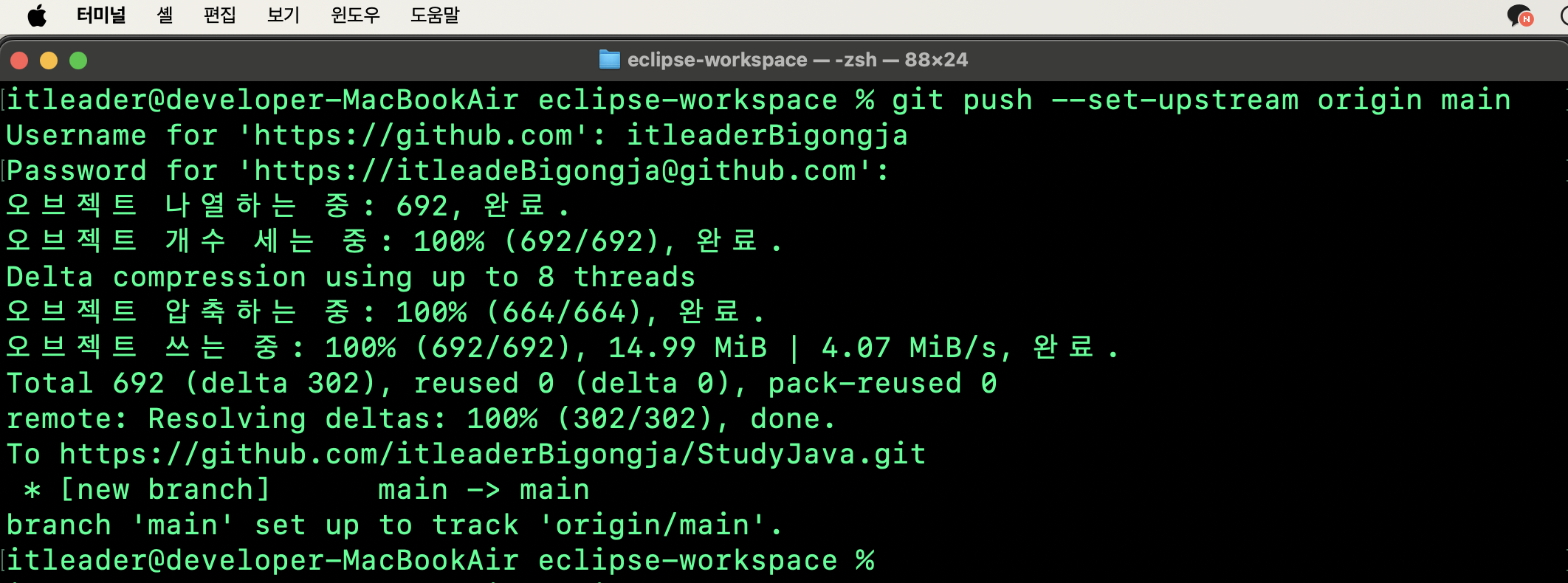 현재 Git의 유저이름과 Password를 입력하라고 나옵니다.